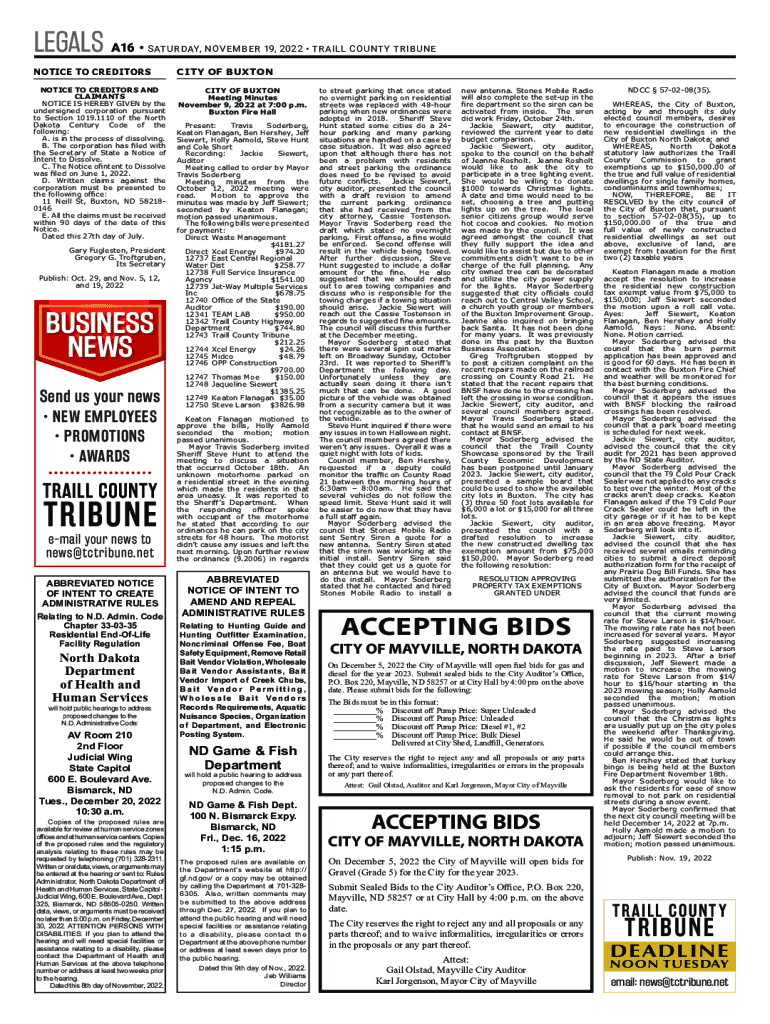 LEGALS A16 SATURDAY, NOVEMBER 19, 2022, TRAIL COUNTY TRIBUNENOTICE TO CREDITORSCITY OF BUXTONNOTICE TO CREDITORS AND