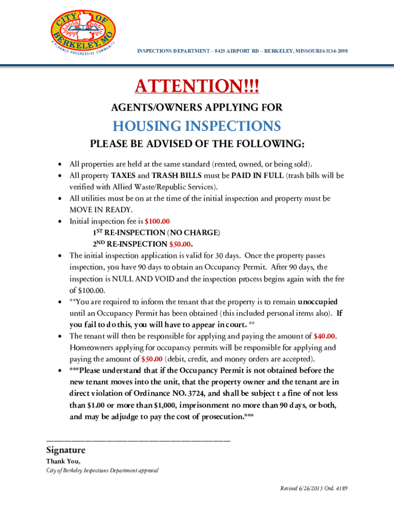 INSPECTIONS DEPARTMENT 8425 AIRPORT RD BERKELEY, MISSOURI 631342098ATTENTION!!! AGENTS/OWNERS APPLYING HOUSING INSPECTIONS PLEASE BE ADVISED OF THE FOLLOWING: All properties are held at the same standard