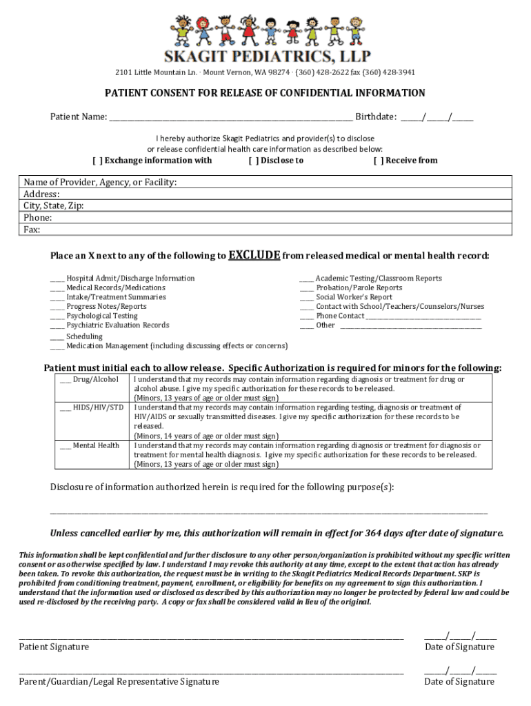 2101 Little Mountain Ln. Mount Vernon, WA 98274 (360) 4282622 fax (360) 4283941PATIENT CONSENT FOR RELEASE OF CONFIDENTIAL INFORMATION Patient Name: ___ Birthdate: ___/___/___ I hereby authorize Skagit