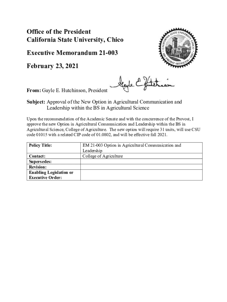 Office of the President California State University, Chico Executive Memorandum 21003 February 23, 2021, From: Gayle E. Hutchinson, President Subject: Approval of the New Option in Agricultural Communication