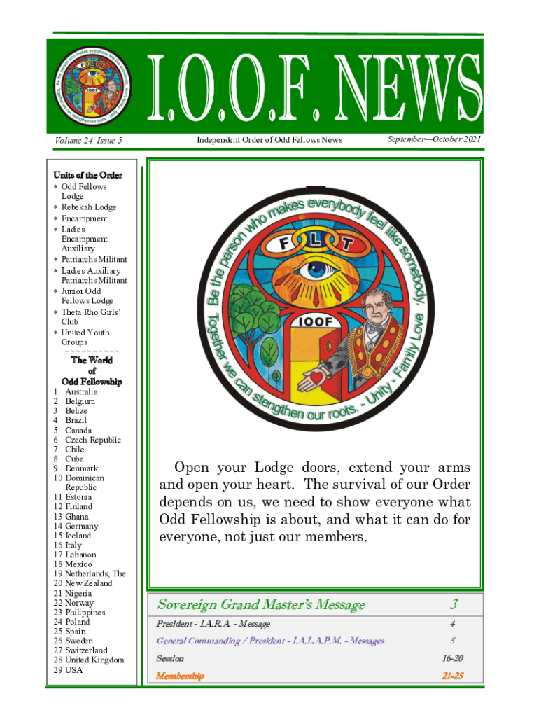 Independent Order of Odd Fellows Newsome 24, Issue 5SeptemberOctober 2021Units of the Order Odd Fellows Lodge Rebekah Lodge Encampment Ladies Encampment Auxiliary Patriarchs Militant Ladies Auxiliary