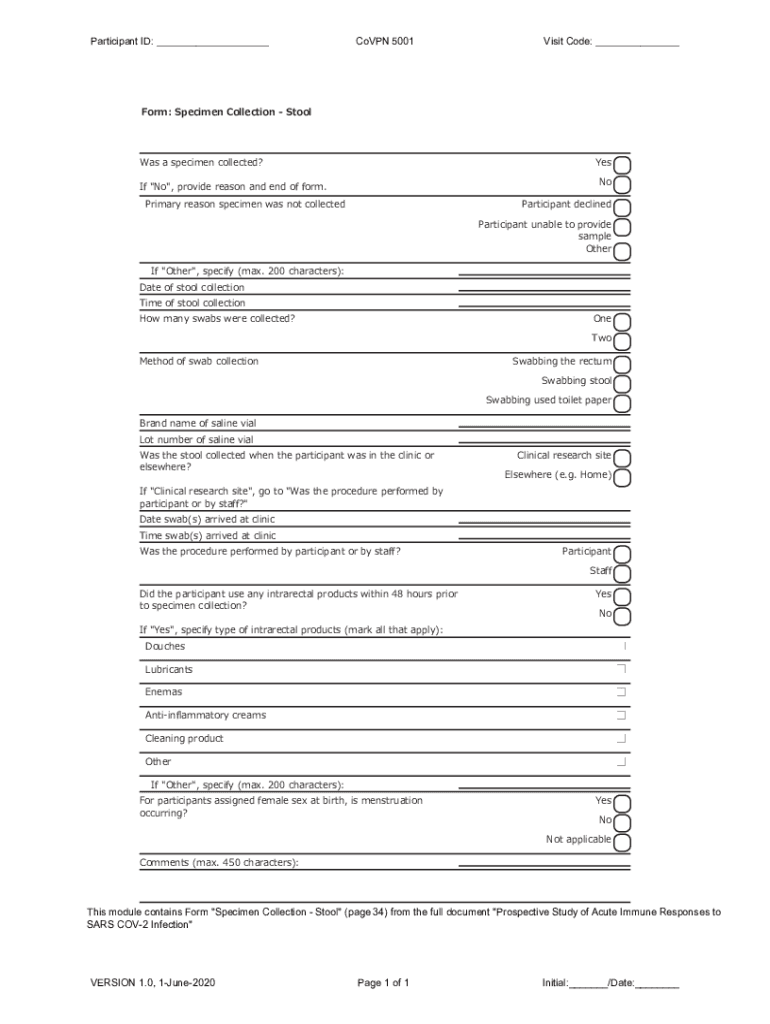 Participant ID: ___Coven 5001Visit Code: ___)RUP6SHFLPHQ&ROOHFWLRQ6WRRO:DVDVSHFLPHQFROOHFWHG\” HE 1R,I1RSURYLGHUHDVRQDQGHQGRIIRUP 3ULPDUUHDVRQVSHFLPHQZDVQRWFROOHFWHG3DUWLFLSDQWGHFOLQHG 3DUWLFLSDQWXQDEOHWRSURYLGH