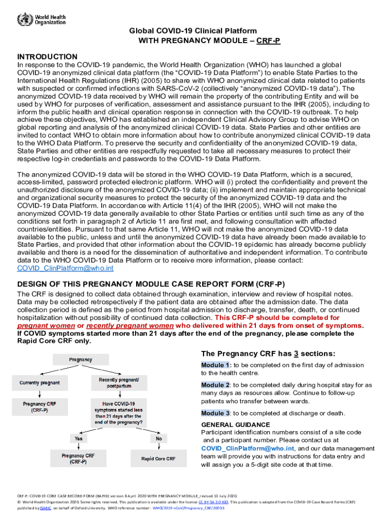 Global COVID-19 Clinical Platform WITH PREGNANCY MODULE CROP INTRODUCTION In response to the COVID-19 pandemic, the World Health Organization (WHO) has launched a global COVID-19 anonymized clinical