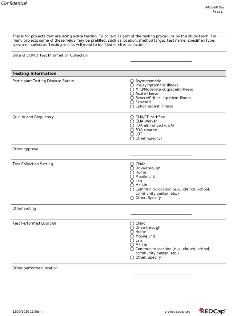 ConfidentialRADxUP Dev Page 1This is for projects that are doing acute testing. To collect as part of the testing procedure by the study team. For many projects some of these fields may be prefilled,