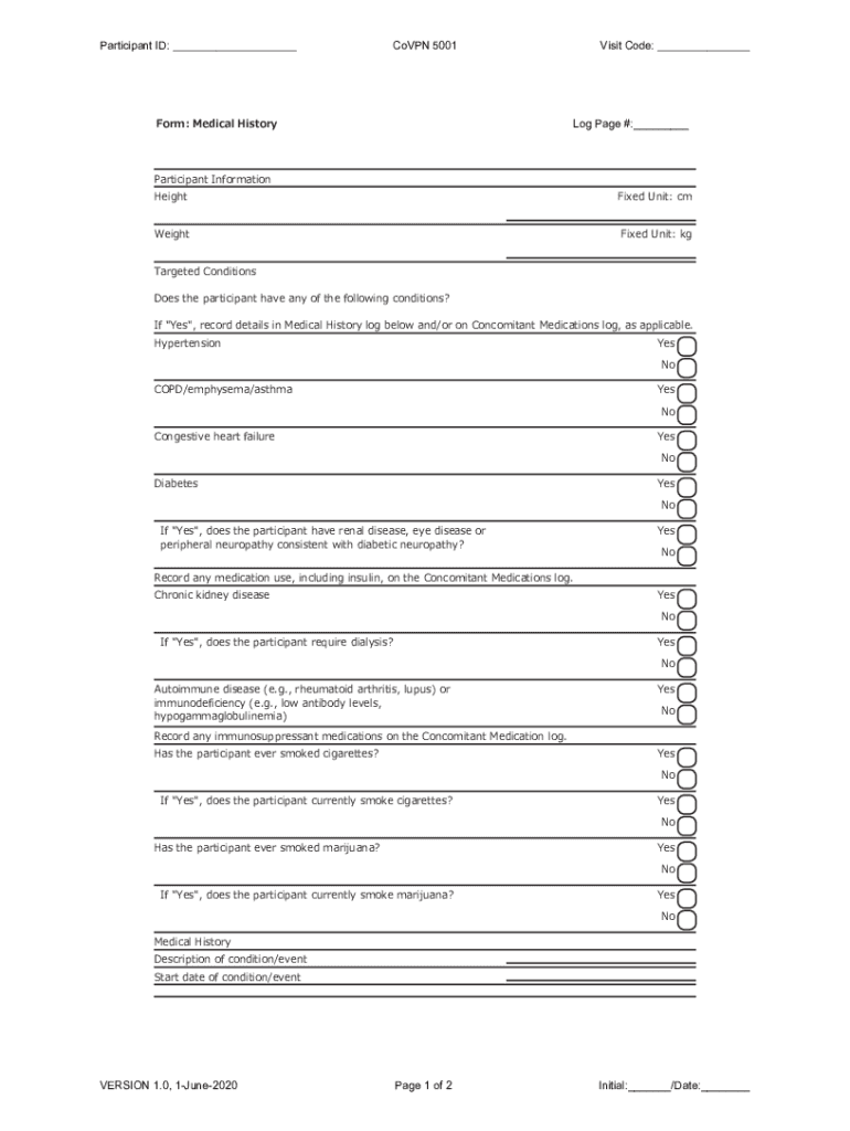 Participant ID: ___Coven 5001)RUP0HGLFDO+LVWRUVisit Code: ___Log Page #:___3DUWLFLSDQW,QIRUPDWLRQ +LIKE)L[HG8QLWFP:LIKE)L[HG8QLWNJ7DUJHWHG&RQGLWLRQV \'RHVWKHSDUWLFLSDQWKDYHDQRIWKHIROORZLQJFRQGLWLRQV\”,