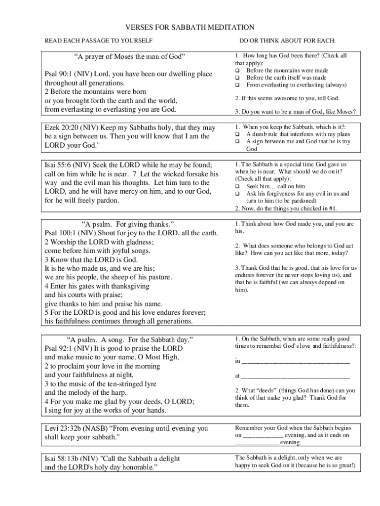 VERSES FOR SABBATH MEDITATION READ EACH PASSAGE TO YOURSELF prayer of Moses the man of God PSA 90:1 (NIV) Lord, you have been our dwelling place throughout all generations. 2 Before the mountains