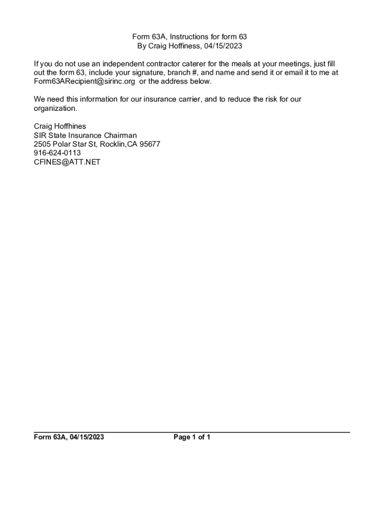 Form 63A, Instructions for form 63 By Craig Huffiness, 04/15/2023 If you do not use an independent contractor caterer for the meals at your meetings, just fill out the form 63, include your signature,
