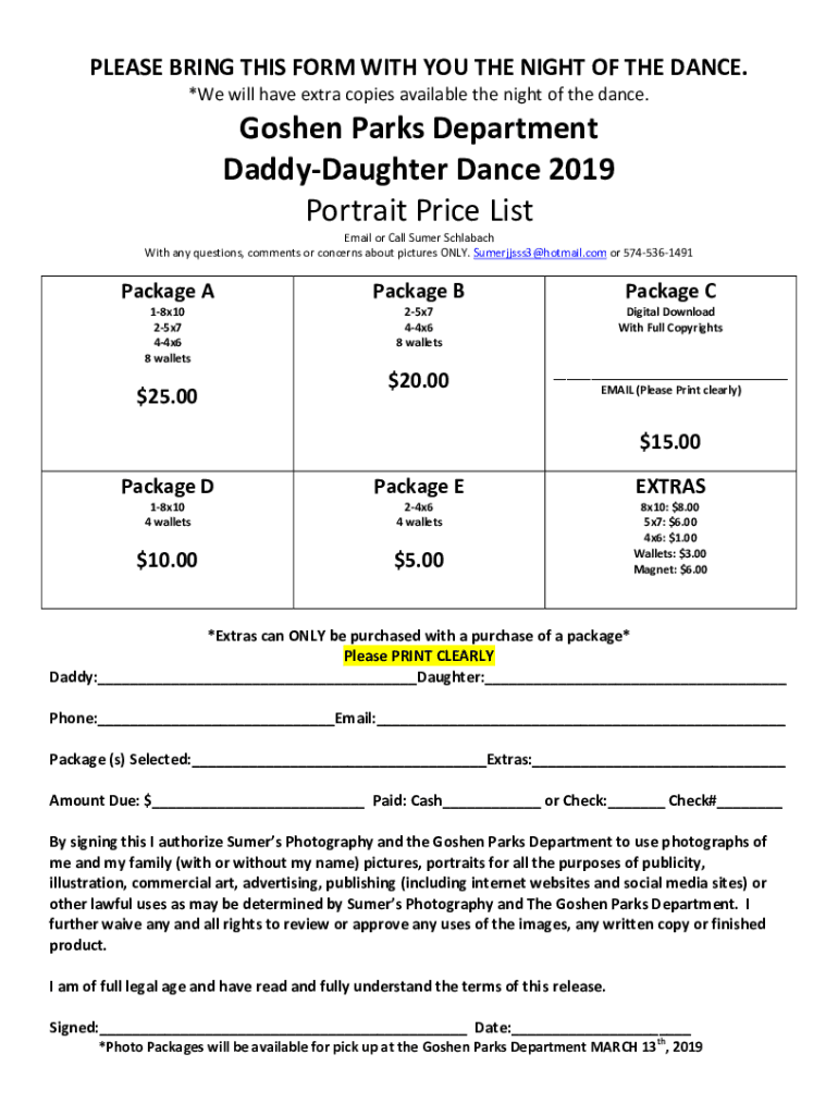 PLEASE BRING THIS FORM WITH YOU THE NIGHT OF THE DANCE. *We will have extra copies available the night of the dance. Goshen Parks Department DaddyDaughter Dance 2019 Portrait Price List Email or Call