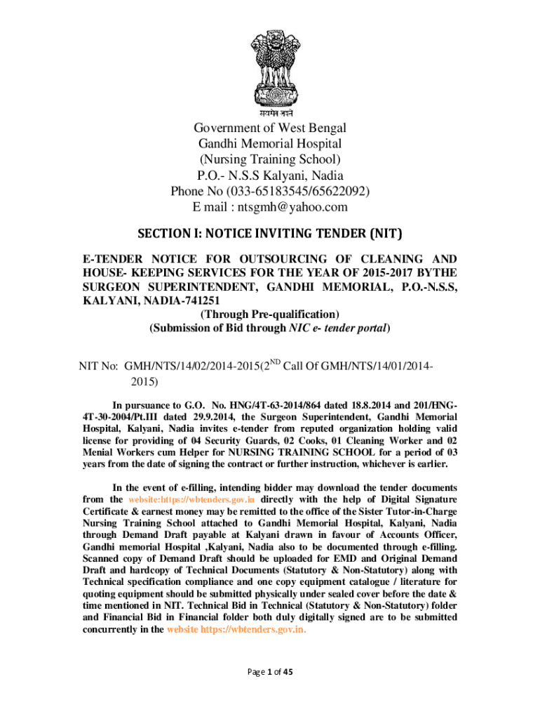 Government of West Bengal Gandhi Memorial Hospital (Nursing Training School) P.O. N.S.S Kalyan, Nadia Phone No (03365183545/65622092) E mail : ntsgmh@yahoo.com SECTION I: NOTICE INVITING TENDER (NIT)
