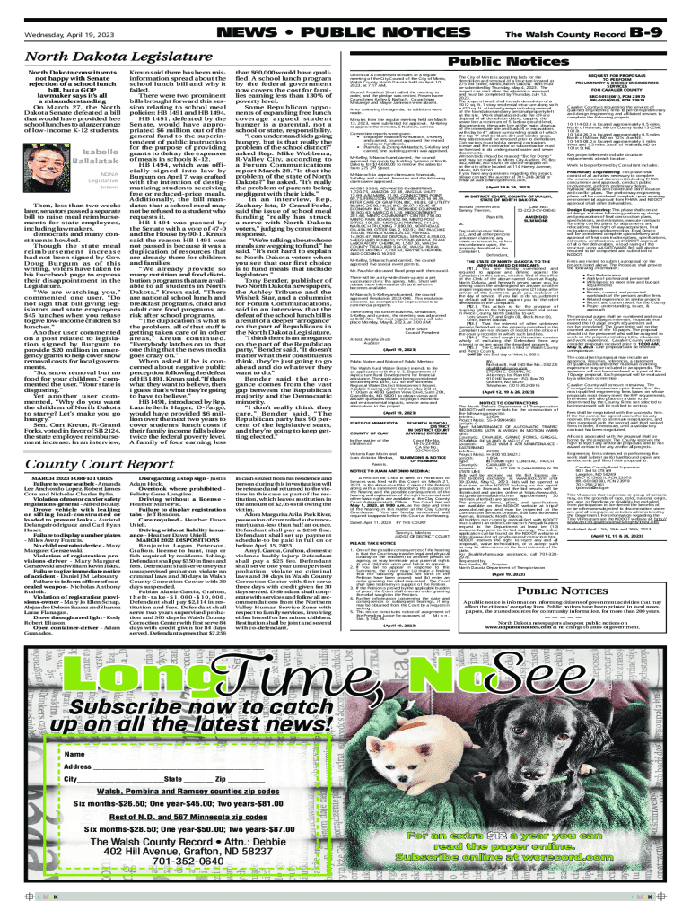 NEWS PUBLIC NOTICES Wednesday, April 19, 2023North Dakota Legislature North Dakota constituents not happy with Senate rejection of a school lunch bill, but a GOP lawmaker says it's all a misunderstanding