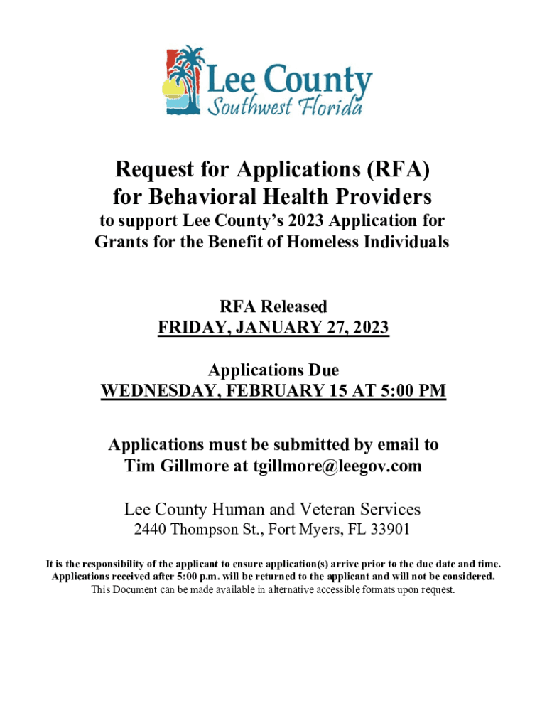Request for Applications (RFA) for Behavioral Health Providers to support Lee Counties 2023 Application for Grants for the Benefit of Homeless Individuals RFA Released FRIDAY, JANUARY 27, 2023, Applications