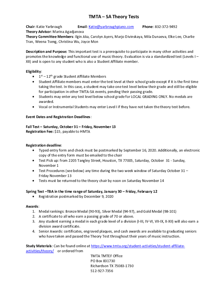 MTA SA Theory Tests Chair: Katie Yarbrough Email: Katie@yarbroughpiano.com Phone: 8323729492 Theory Advisor: Marina Agadjanova Theory Committee Members: ILGN Aka, Carolyn Ayers, Mario Divinskaya,