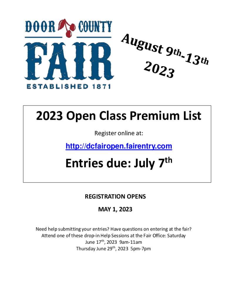 2023 Open Class Premium List Register online at:http://dcfairopen.fairentry.comEntries due: July 7th REGISTRATION OPENS MAY 1, 2023, Need help submitting your entries? Have questions on entering at