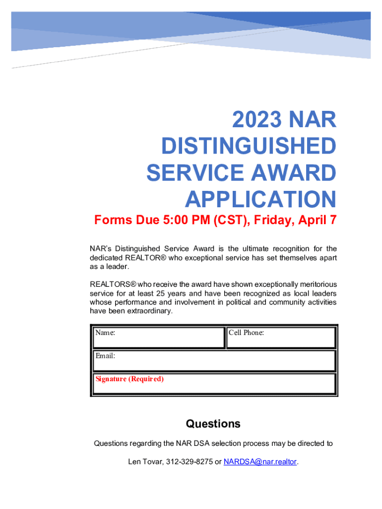 2023 NEAR DISTINGUISHED SERVICE AWARD APPLICATIONForms Due 5:00 PM (CST), Friday, April 7 Cars Distinguished Service Award is the ultimate recognition for the dedicated REALTOR who exceptional service