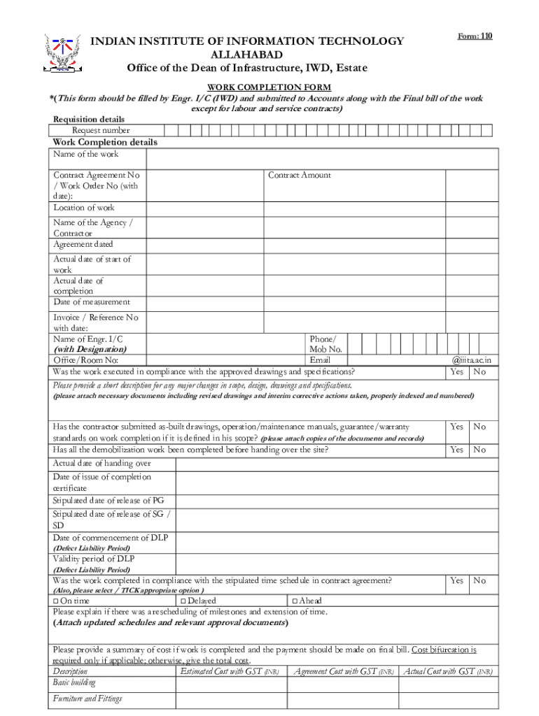 INDIAN INSTITUTE OF INFORMATION TECHNOLOGY ALLAHABAD Office of the Dean of Infrastructure, ID, Stateroom: 110WORK COMPLETION FORM *(This form should be filled by ENG. I/C (ID) and submitted to Accounts