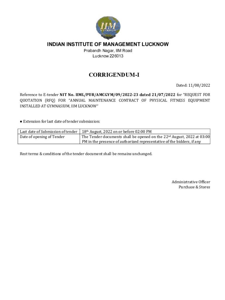 INDIAN INSTITUTE OF MANAGEMENT LUCKNOW Armband Nagar, IIM Road Lucknow 226013CORRIGENDUMI Dated: 11/08/2022 Reference to Tender NIT No. IIM/PUR/GYM/09/202223 dated 21/07/2022 for REQUEST FOR QUOTATION
