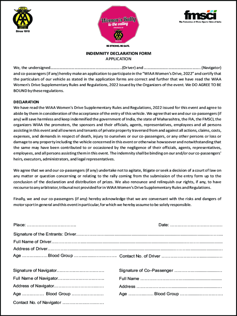 PRESENTSPOWERED ORGANIZED INDEMNITY DECLARATION FORM APPLICATION We, the undersigned.(Driver) and. (Navigator) and copassengers (if any) hereby make an application to participate in the WIAA Women\'s