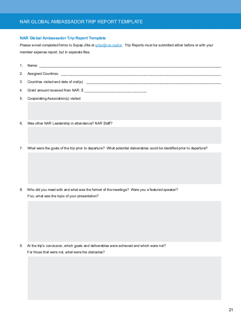 Get the free NAR GLOBAL AMBASSADOR TRIP REPORT TEMPLATE