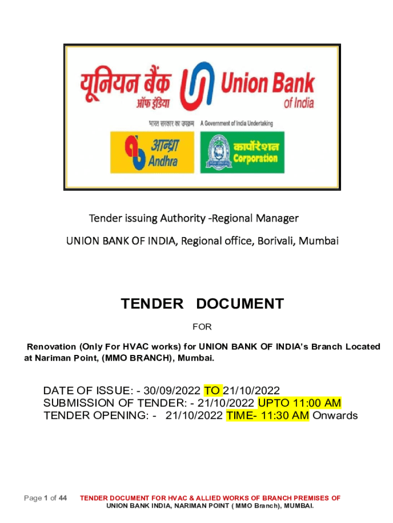 Tender issuing Authority Regional Manager UNION BANK OF INDIA, Regional office, Arrival, MumbaiTENDER DOCUMENT FOR Renovation (Only For HVAC works) for UNION BANK OF INDIA's Branch Located at Norman