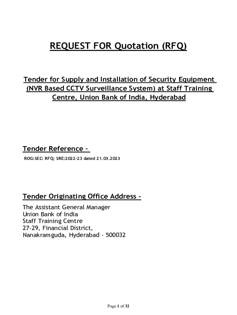 REQUEST FOR Quotation (RFQ)Tender for Supply and Installation of Security Equipment (NVR Based CCTV Surveillance System) at Staff Training Center, Union Bank of India, HyderabadTender Reference DOG:SEC: