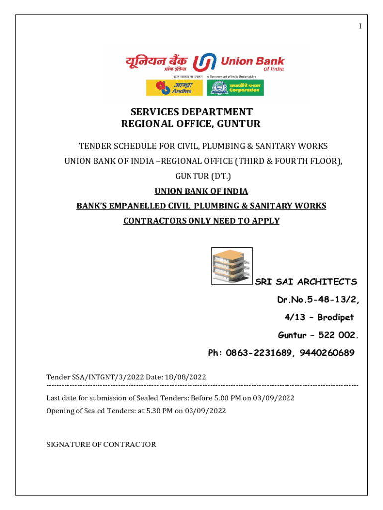 SERVICES DEPARTMENT REGIONAL OFFICE, GUNTUR TENDER SCHEDULE FOR CIVIL, PLUMBING & SANITARY WORKS UNION BANK OF INDIA REGIONAL OFFICE (THIRD & FOURTH FLOOR), GUNTUR (DT.) UNION BANK OF INDIA BANKS