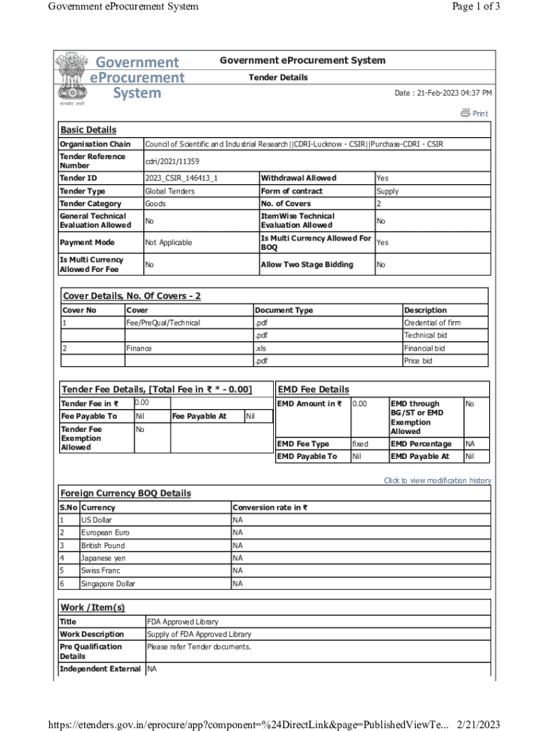 Government procurement System Page 1 of 3Government procurement System Tender Details Date : 21Feb2023 04:37 PM PrintBasic Details Organization ChainCouncil of Scientific and Industrial Research||CDRILucknow