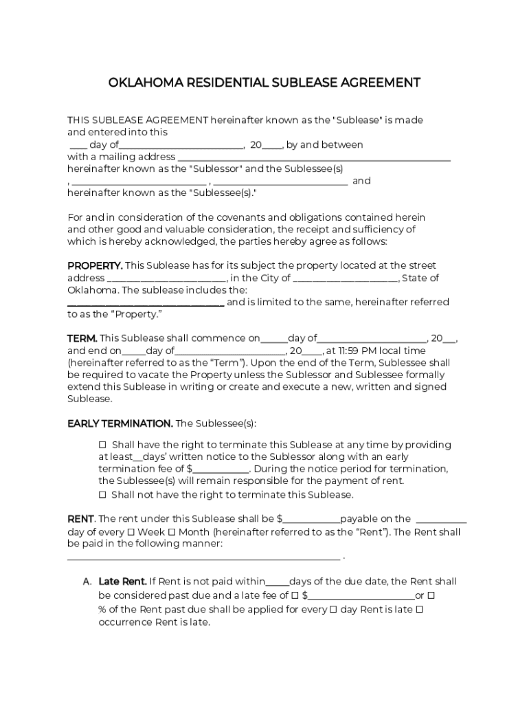 OKLAHOMA RESIDENTIAL SUBLEASE AGREEMENT THIS SUBLEASE AGREEMENT hereinafter known as the \” Sublease\” is made and entered into this day of, 20, by and between with a mailing address hereinafter