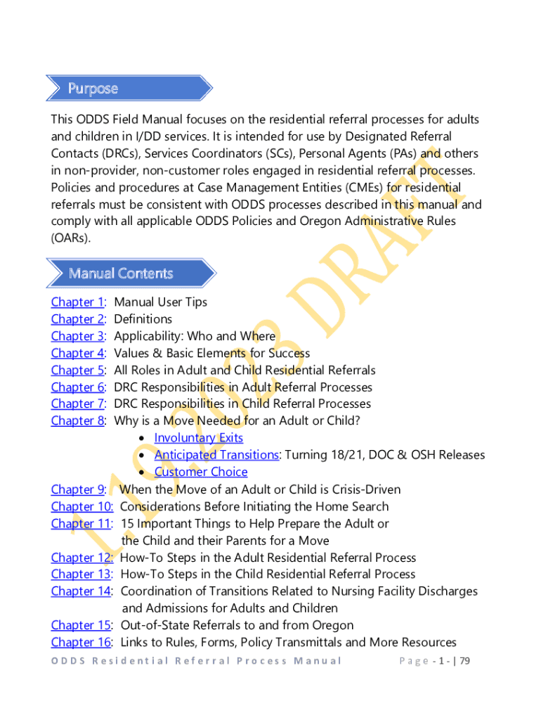 Purpose This ODDS Field Manual focuses on the residential referral processes for adults and children in I/DD services. It is intended for use by Designated Referral Contacts (Arcs), Services Coordinators
