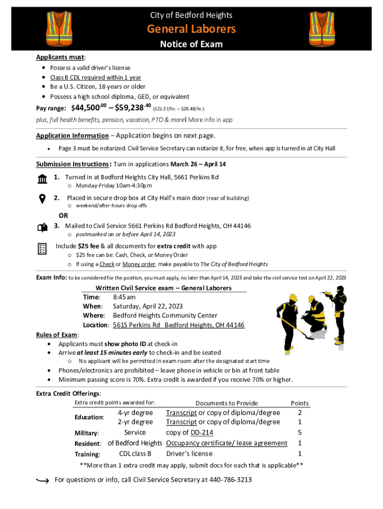 City of Bedford HeightsGeneral Laborers Notice of Exam Applicants must: Possess a valid driver's license Class B CDL required within 1 year Be a U.S. Citizen, 18 years or older Possess a high school
