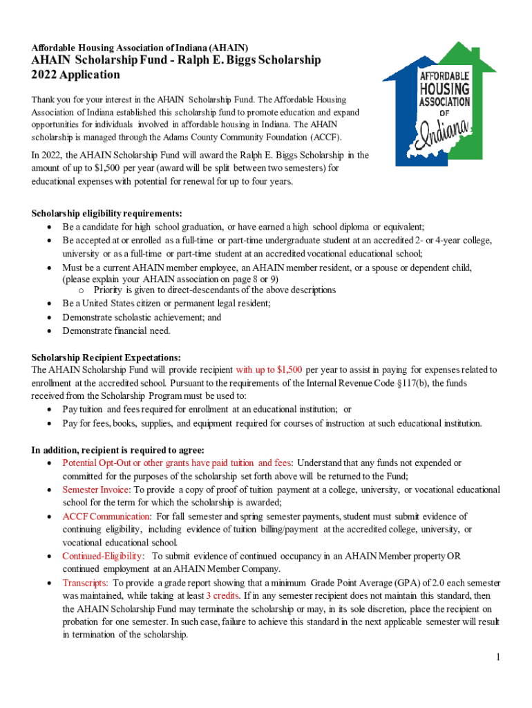 Affordable Housing Association of Indiana (AGAIN)AGAIN Scholarship Fund Ralph E. Biggs Scholarship 2022 Application Thank you for your interest in the AGAIN Scholarship Fund. The Affordable Housing