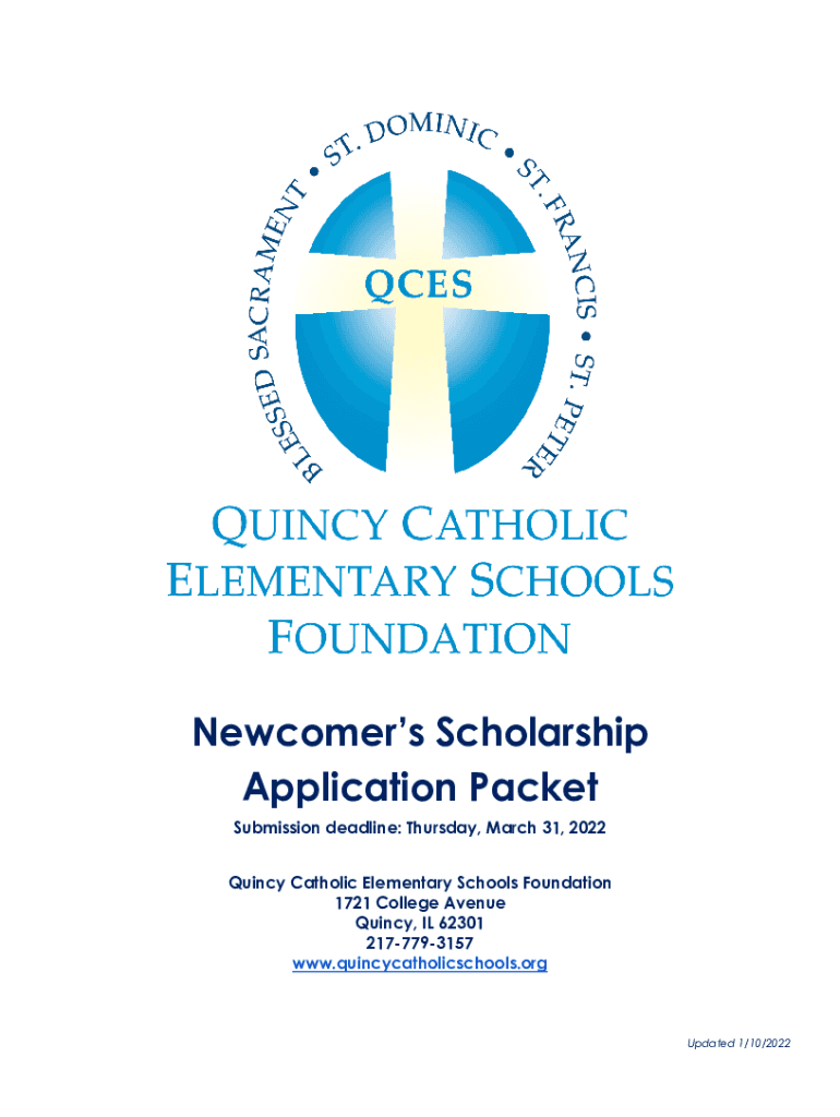 Newcomers Scholarship Application Packet Submission deadline: Thursday, March 31, 2022, Quincy Catholic Elementary Schools Foundation 1721 College Avenue Quincy, IL 62301 2177793157 www.quincycatholicschools.orgUpdated