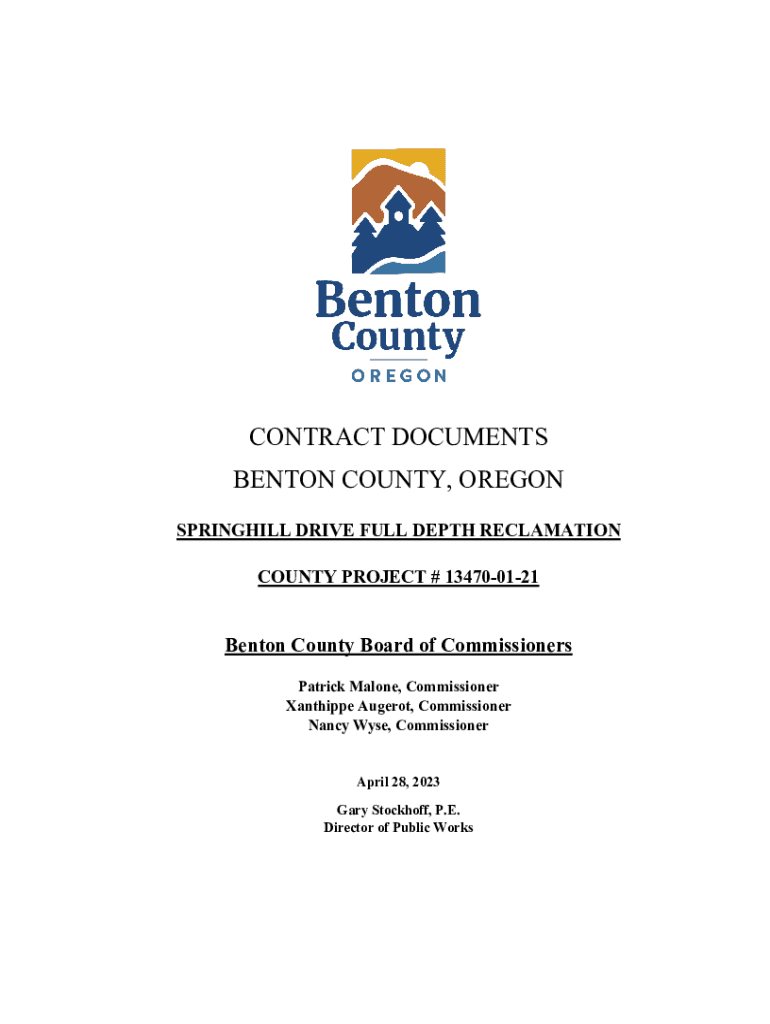CONTRACT DOCUMENTS BENTON COUNTY, OREGON SPRINGILY DRIVE FULL DEPTH RECLAMATION COUNTY PROJECT # 134700121Benton County Board of Commissioners Patrick Malone, Commissioner Xanthippe Auger, Commissioner