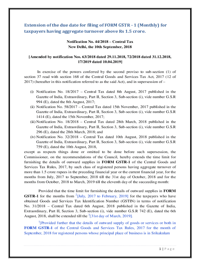 Extension of the due date for filing of FORM GSPR 1 (Monthly) for taxpayers having aggregate turnover above Rs 1.5 crore. Notification No. 44/2018 Central Tax New Delhi, the 10th September 2018 [Amended