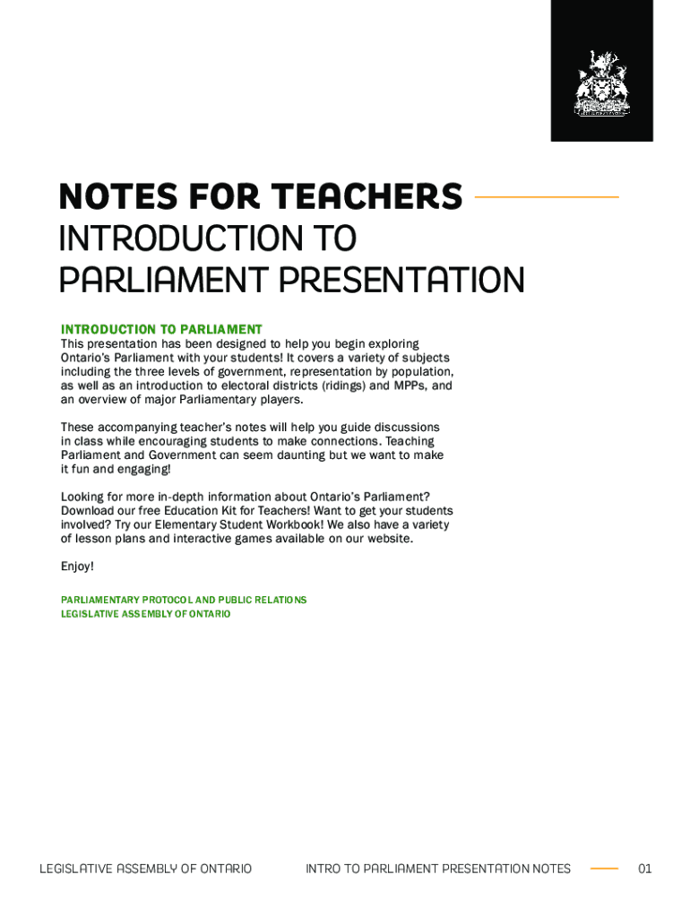 NOTES FOR TEACHERS INTRODUCTION TO PARLIAMENT PRESENTATION INTRODUCTION TO Parliaments presentation has been designed to help you begin exploring Ontario's Parliament with your students! It covers