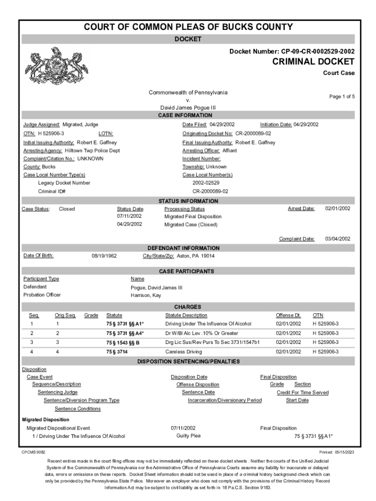 DOCKET Number: CP09CR00025292002CRIMINAL DOCKET