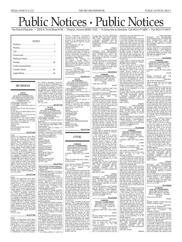 FRIDAY, MARCH 10, 2023THE RECORD REPORTERPUBLIC NOTICES, PAGE 5Public Notices Public Noticeable Record Reporter 2025 N. Third Street #155 Phoenix, Arizona 85004 1425 To Subscribe or Advertise, Call