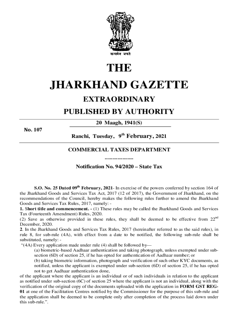 THE JHARKHAND GAZETTE EXTRAORDINARY PUBLISHED BY AUTHORITY 20 Half, 1941(S) No. 107 Ranchi, Tuesday, 9th February, 2021 COMMERCIAL TAXES DEPARTMENT Notification No. 94/2020 State Tax. O. No. 25 Dated