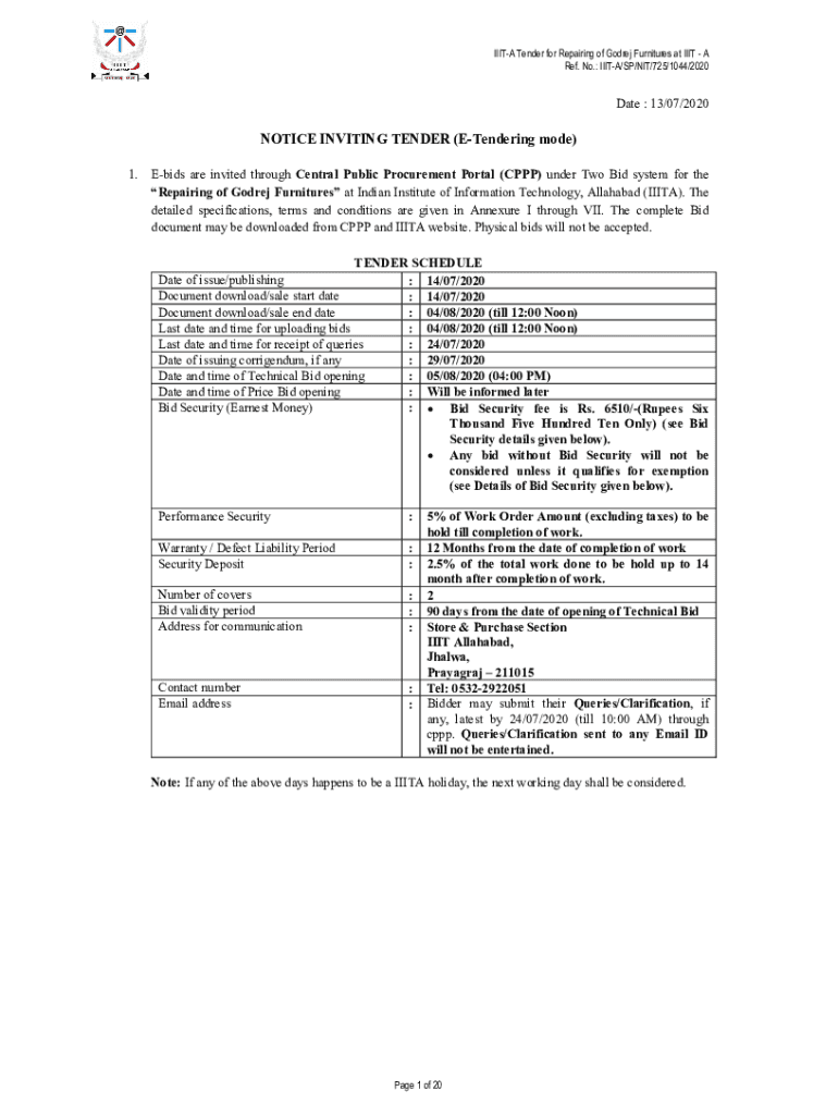 II ITA Tender for Repairing of Gore Furniture sat IIT A Ref. No.: II ITA/SP/NIT/725/1044/2020Date : 13/07/2020NOTICE INVITING TENDER (Tendering mode) 1. Bids are invited through Central Public Procurement