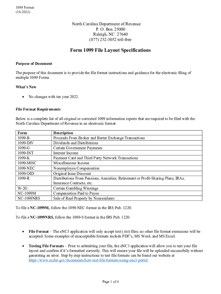 1099 Format (102022)North Carolina Department of Revenue P. O. Box 25000 Raleigh, NC 27640 (877) 2523052 tollfreeForm 1099 File Layout Specifications Purpose of Document The purpose of this document