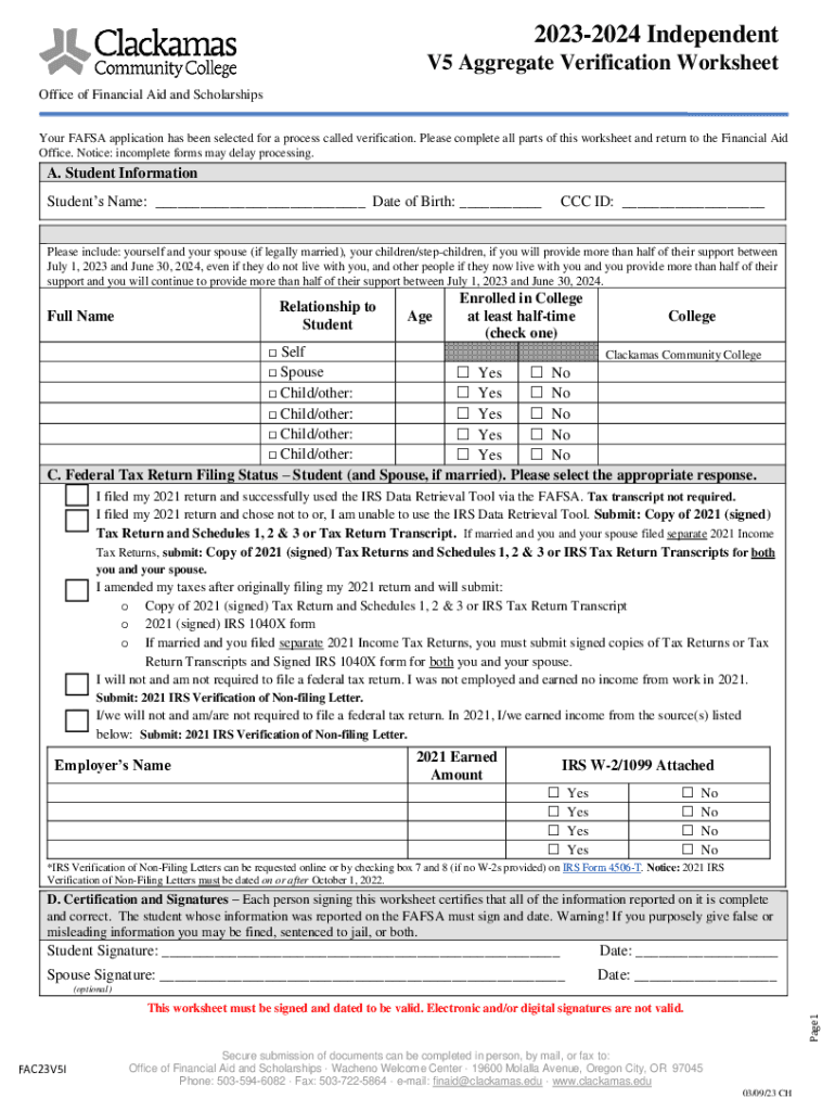 20232024 Independent V5 Aggregate Verification Worksheet Office of Financial Aid and Scholarships Your FAFSA application has been selected for a process called verification. Please complete all parts