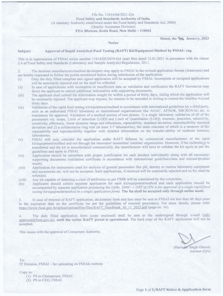 APPLICATION FORM FOR APPROVAL OF RAPID ANALYTICAL FOOD TESTING (RAFT) KIT/EQUIPMENT/ METHOD BY FSSAI A. Application for (tick whichever is appropriate) Rapid food testing kit/media Rapid Equipment