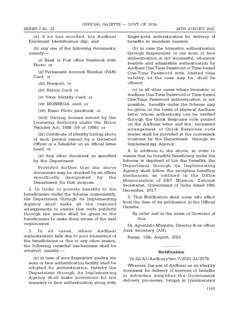 OFFICIAL GAZETTE GOVT. OF GOA SERIES I No. 2226TH AUGUST 2021(a) if he has enrolled, his Aadhaar Enrollment Identification slip; and fingerprint authentication for delivery of benefits in seamless