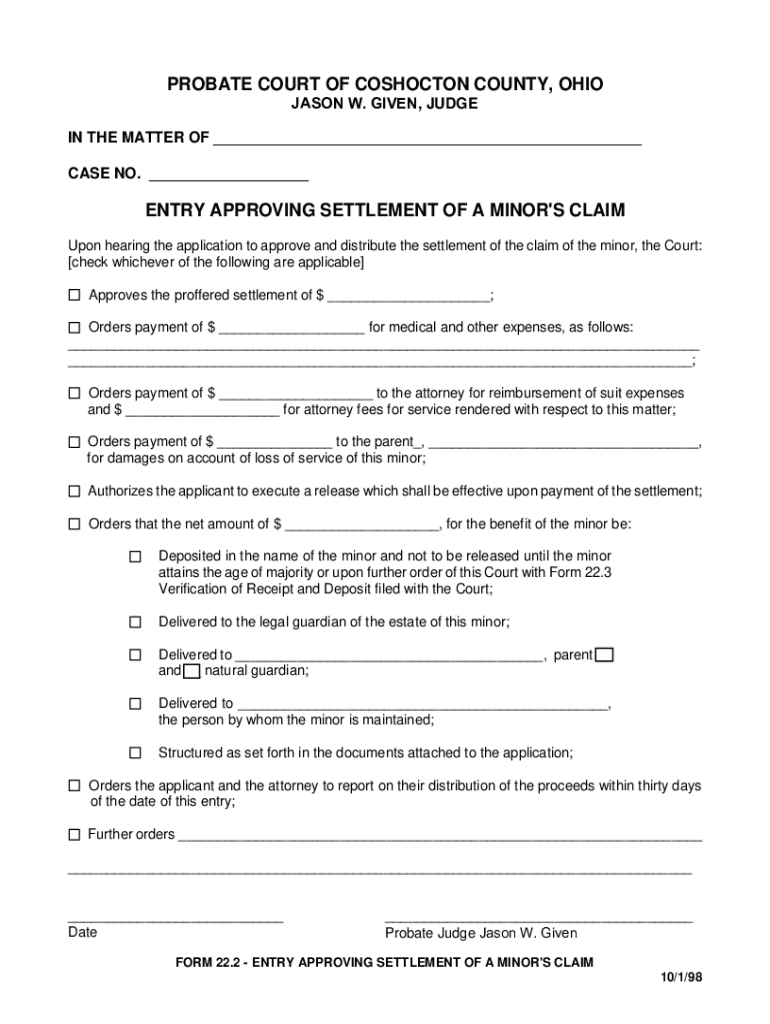 PROBATE COURT OF CONCOCTION COUNTY, OHIO JASON W. GIVEN, JUDGE IN THE MATTER OF ___ CASE NO. ___ENTRY APPROVING SETTLEMENT OF A MINOR\'S CLAIM Upon hearing the application to approve and distribute