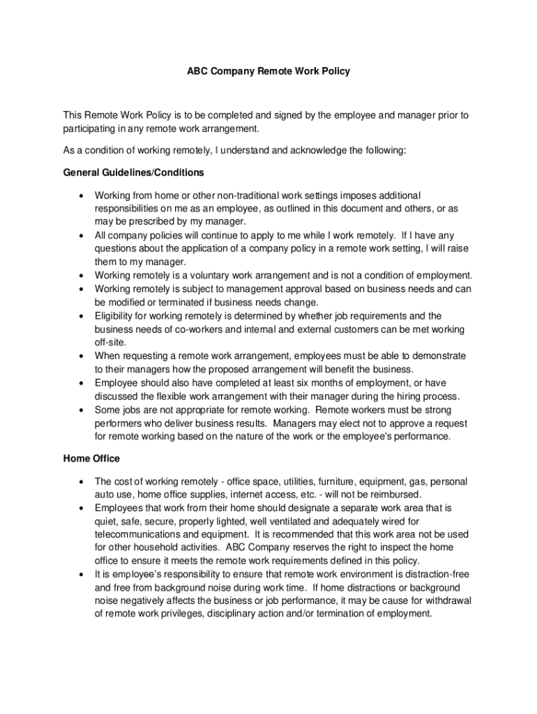 ABC Company Remote Work PolicyThis Remote Work Policy is to be completed and signed by the employee and manager prior to participating in any remote work arrangement. As a condition of working remotely,
