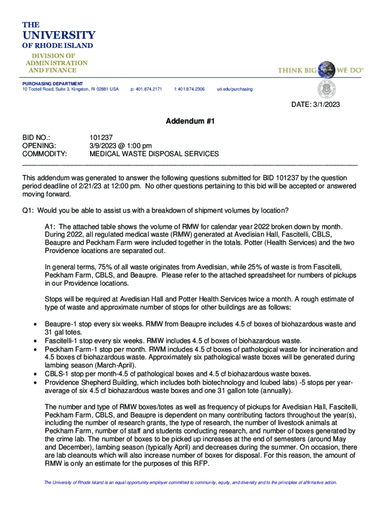 PREUNIVERSITY OF RHODE ISLAND DIVISION OF ADMINISTRATION AND FINANCE PURCHASING DEPARTMENT 10 To tell Road, Suite 3, Kingston, RI 02881 USA: 401.874.2171f: 401.874.2306uri.edu/purchasingDATE: 3/1/2023Addendum