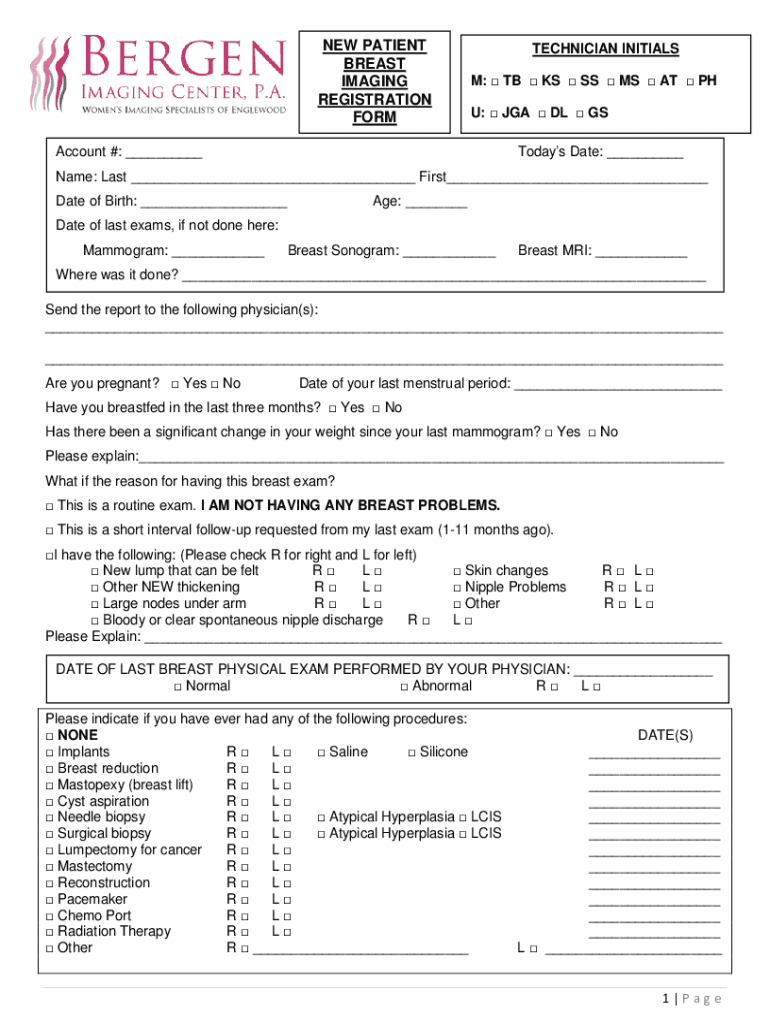 NEW PATIENT BREAST IMAGING REGISTRATION FORMTECHNICIAN INITIALS M: TB KS SS MS AT PH U: JMA DL Account #: ___Today's Date: ___Name: Last ___ First___ Date of Birth: ___Age: ___Date of last exams,