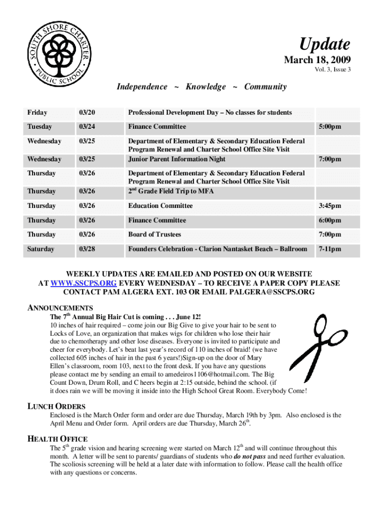 Update March 18, 2009, Vol. 3, Issue 3Independence Knowledge Community Friday03/20Professional Development Day No classes for studentsTuesday03/24Finance Committee5:00pmWednesday03/25Wednesday03/25Department