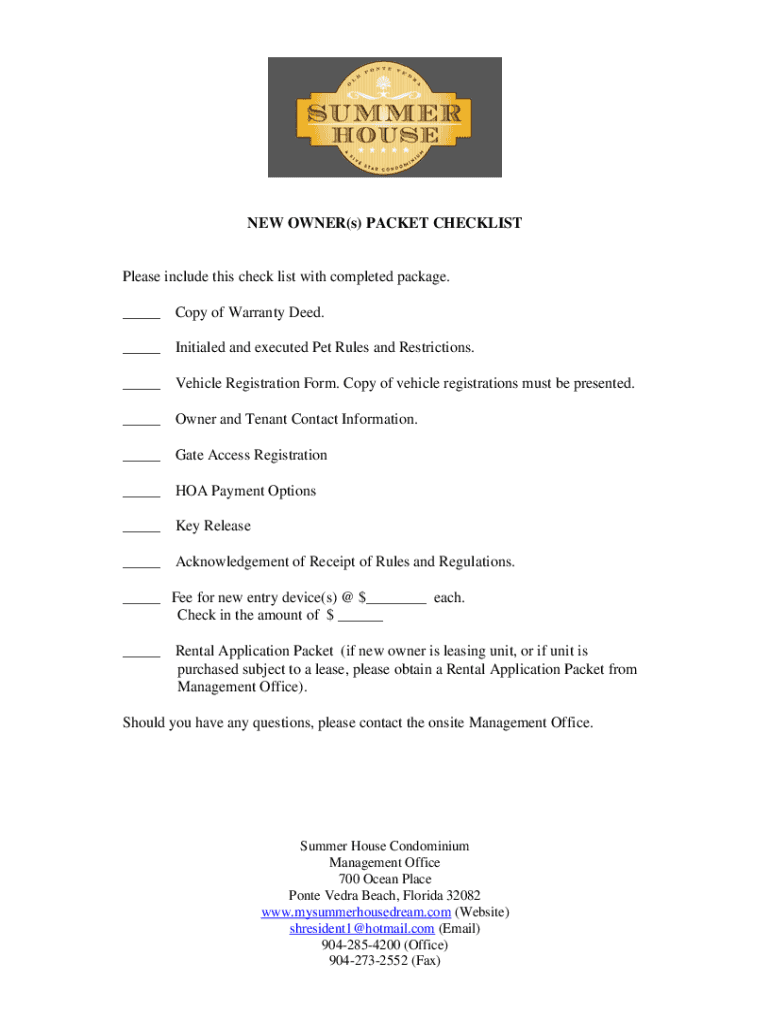 The new owners packet checklist may require information such as contact details, property details, payment information, and any other relevant documentation.