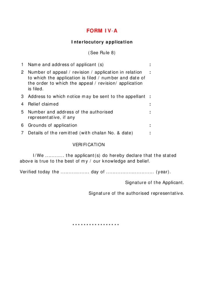 FORM IVA Interlocutory application (See Rule 8) 1 Name and address of applicant (s):2 Number of appeal / revision / application in relation : to which the application is filed / number and date of