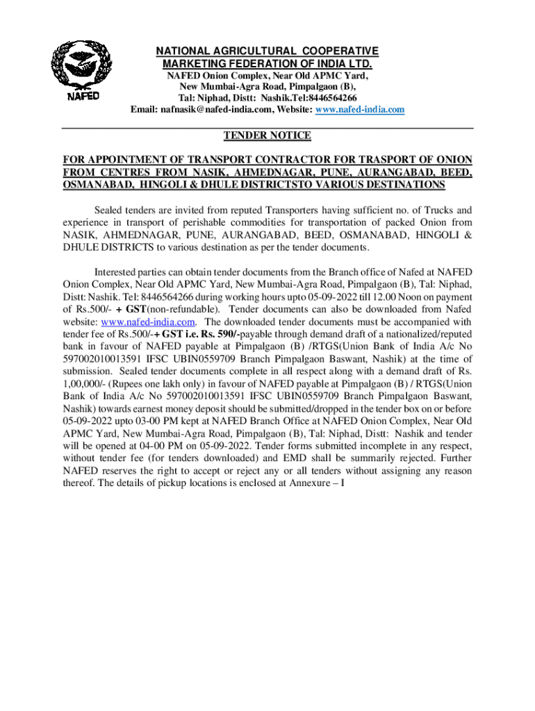 NATIONAL AGRICULTURAL COOPERATIVE MARKETING FEDERATION OF INDIA LTD. NAMED Onion Complex, Near Old APC Yard, New Mumbai Agra Road, Pimpalgaon (B), Tail: Nip had, Dist: Nashik. Tel:8446564266 Email: